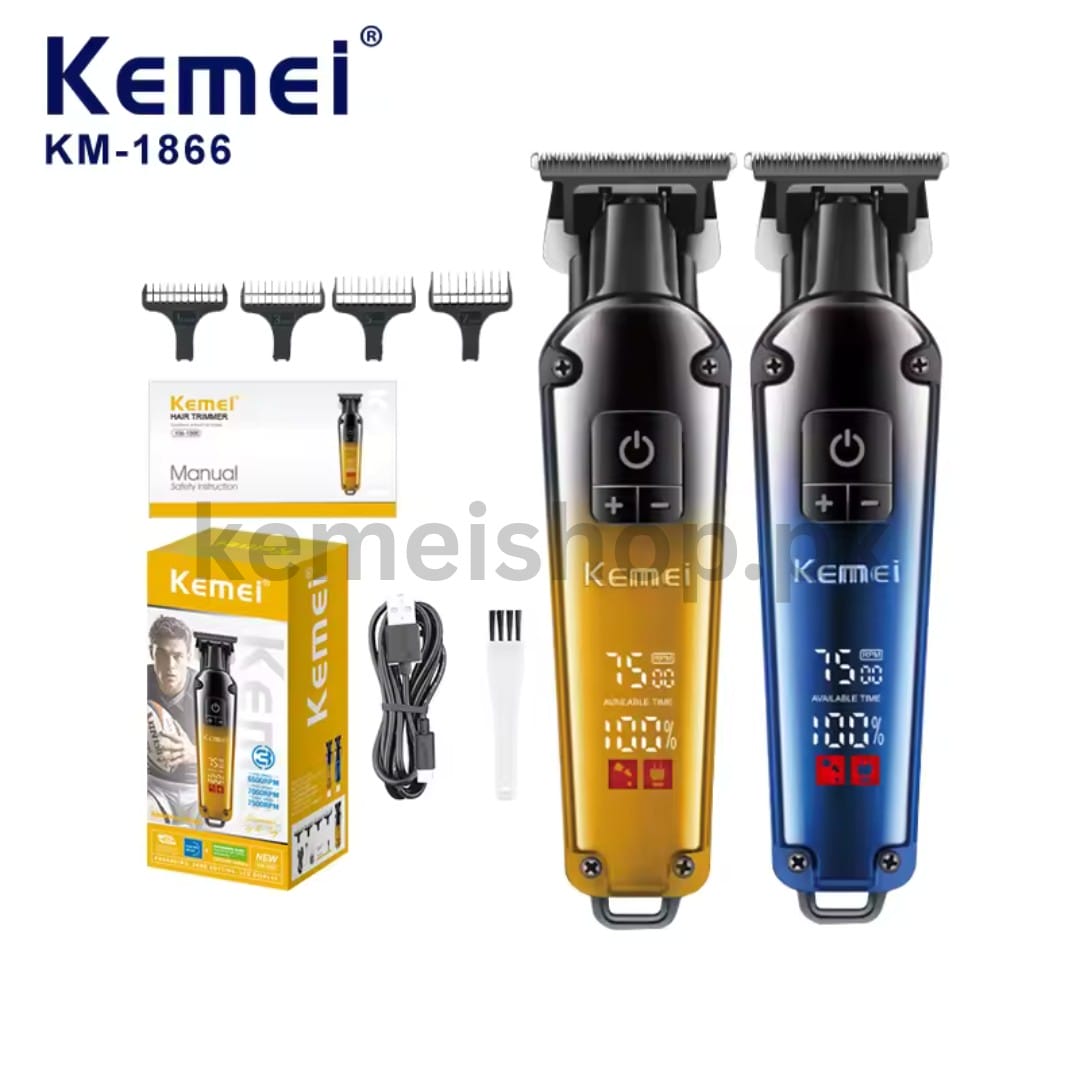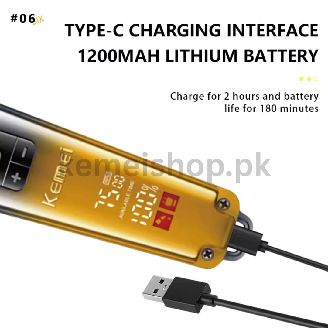 Professional hair trimmer designed for versatile grooming. Equipped with advanced blade technology for clean, precise cuts. Features cordless operation with extended battery life. Stainless steel blade with adjustable cutting lengths for various styling needs. LCD display shows battery level. Fast charging capability delivers power in minimal time. Ideal for both professionals and home users who require a reliable, efficient trimming tool.